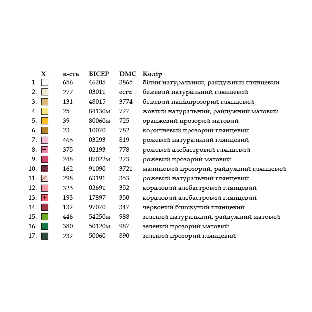 - title key with recommended colors of Preciosa beads or DMC threads and their quantity.