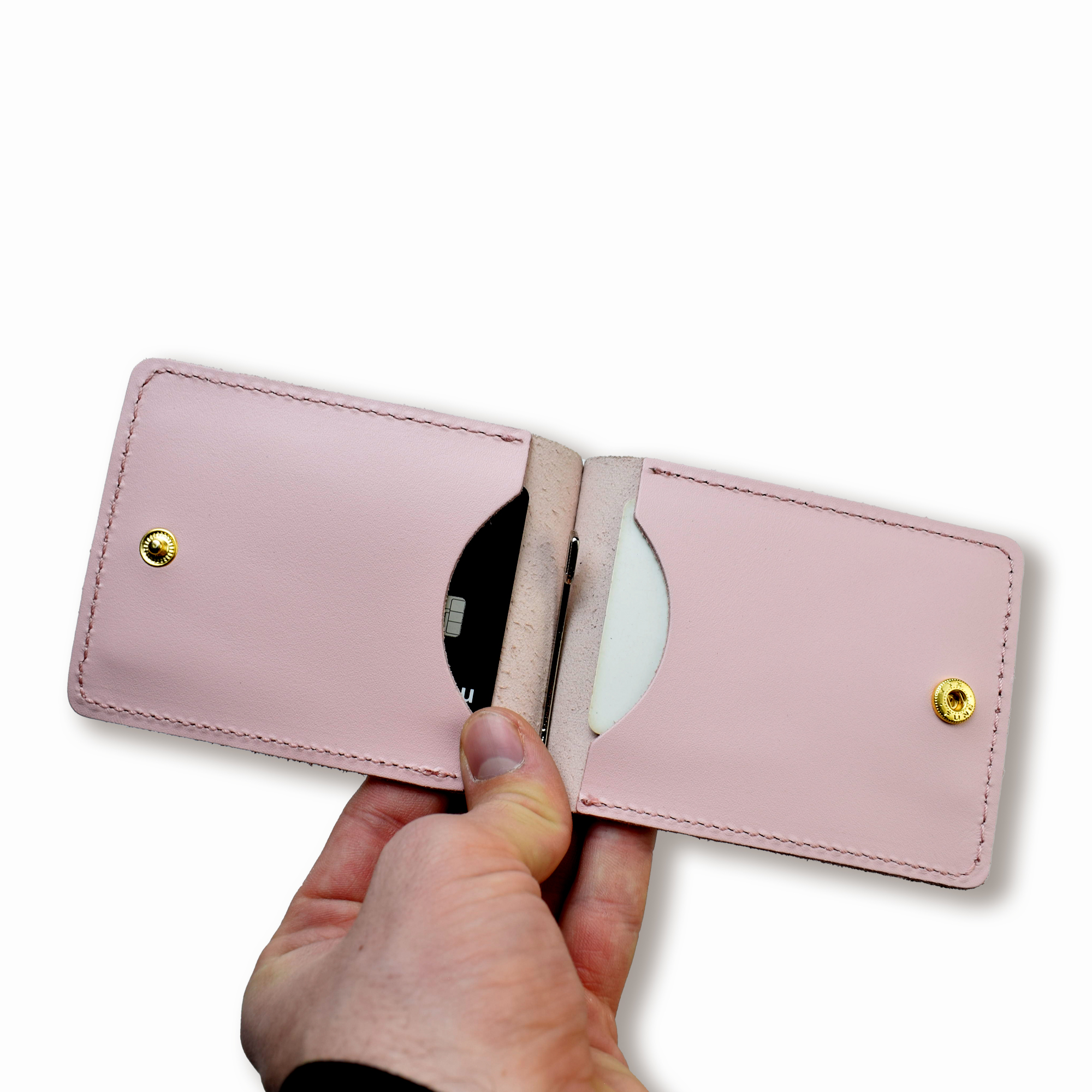 Благодаря компактному размеру зажим легко помещается в карман, а надежная металлическая клипса прочно фиксирует банкноты. Два внутренних кармана для карт позволяют организовать все необходимое — удобно, стильно, без лишнего.