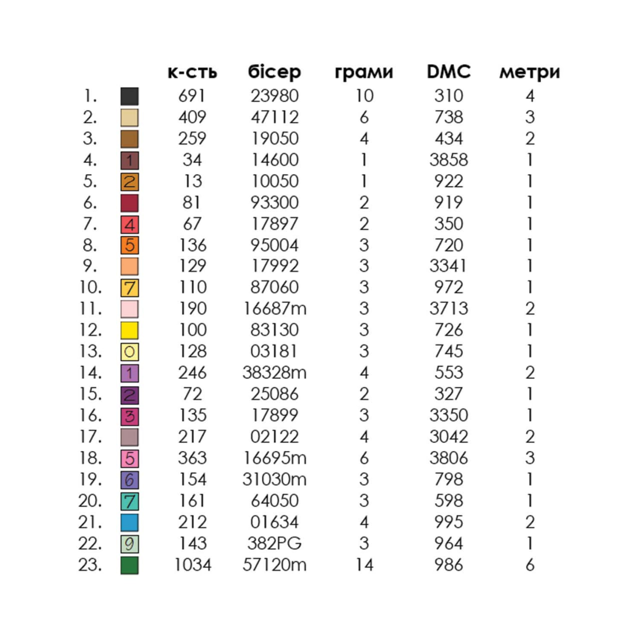 - титулка-ключ с рекомендованными цветами бисера Preciosa или мулине DMC и их количеством.