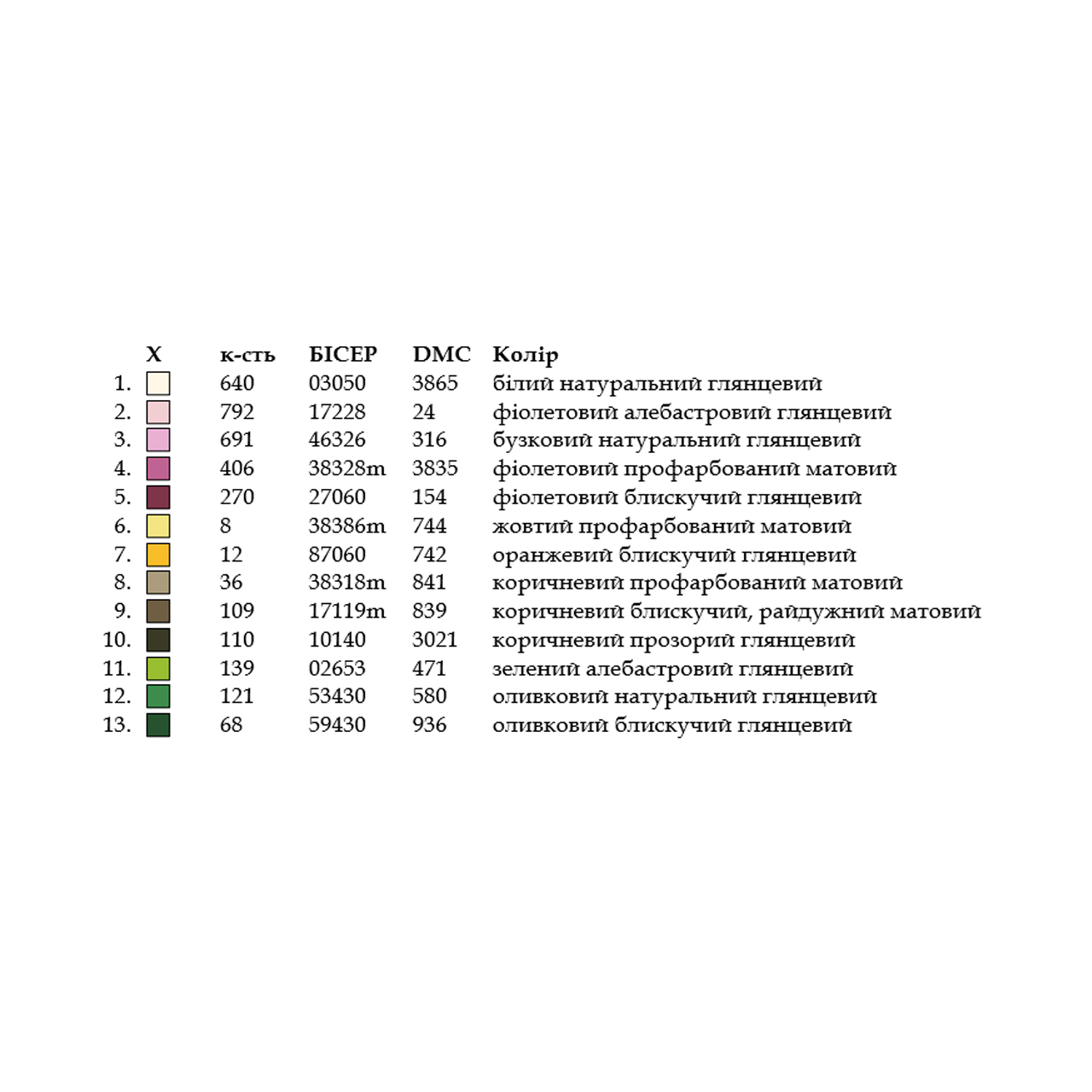- титулка-ключ з рекомендованими кольорами бісеру Preciosa або муліне DMC та їх кількістю.
