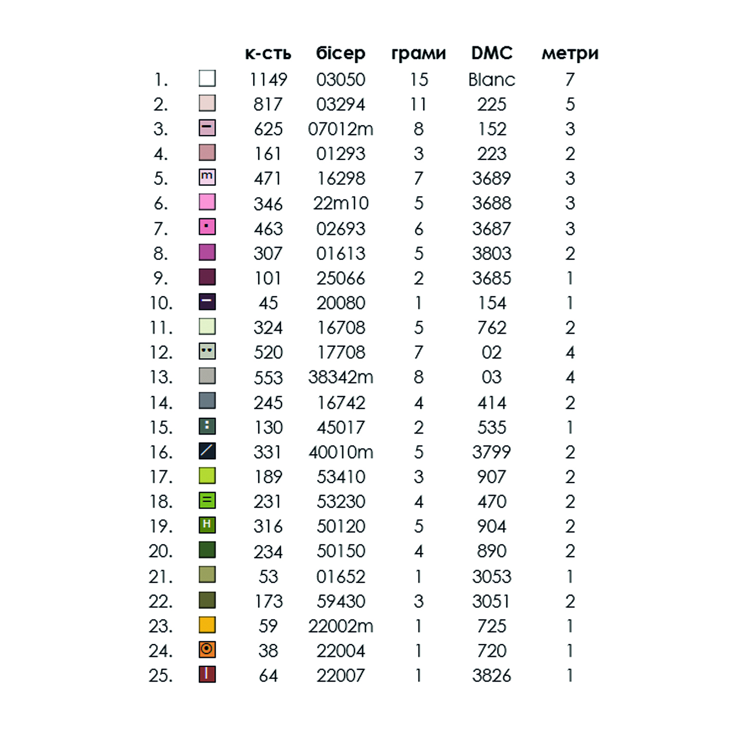 - титулка-ключ з рекомендованими кольорами бісеру Preciosa або муліне DMC та їх кількістю.