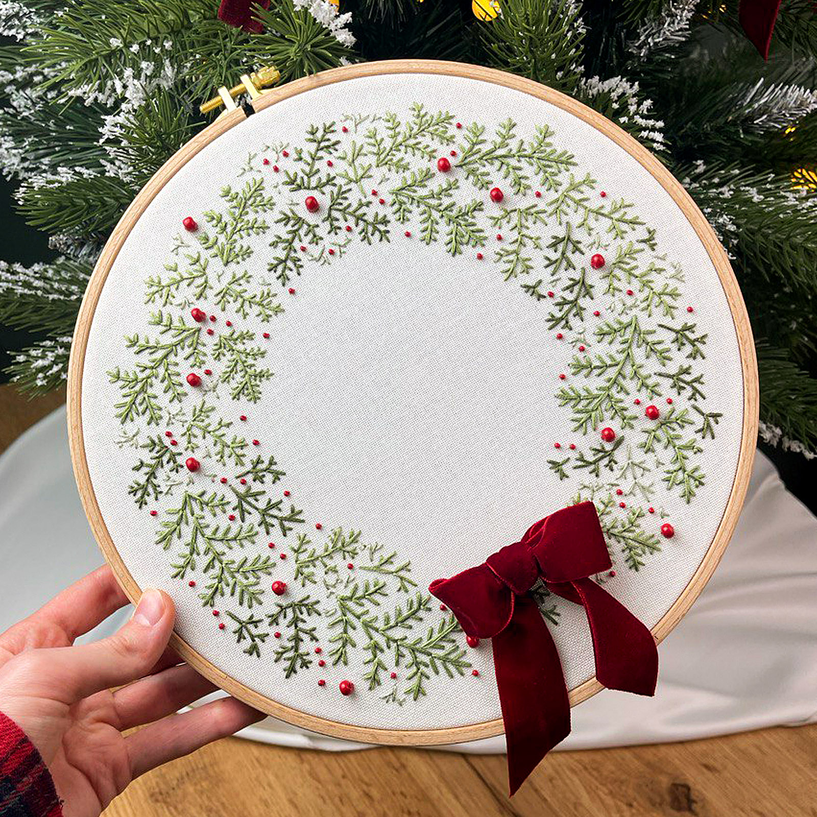 Зимовий набір для вишивання «Святковий вінок» виконаний у гармонійній новорічній кольоровій гамі: натуральні відтінки зелені імітують хвою, а яскраві червоні акценти додають святкового настрою. Декоративний оксамитовий бантик завершує композицію, роблячи готову роботу об’ємною, естетичною та ідеальною для різдвяного декору, новорічного панно або святкового оформлення інтер’єру.